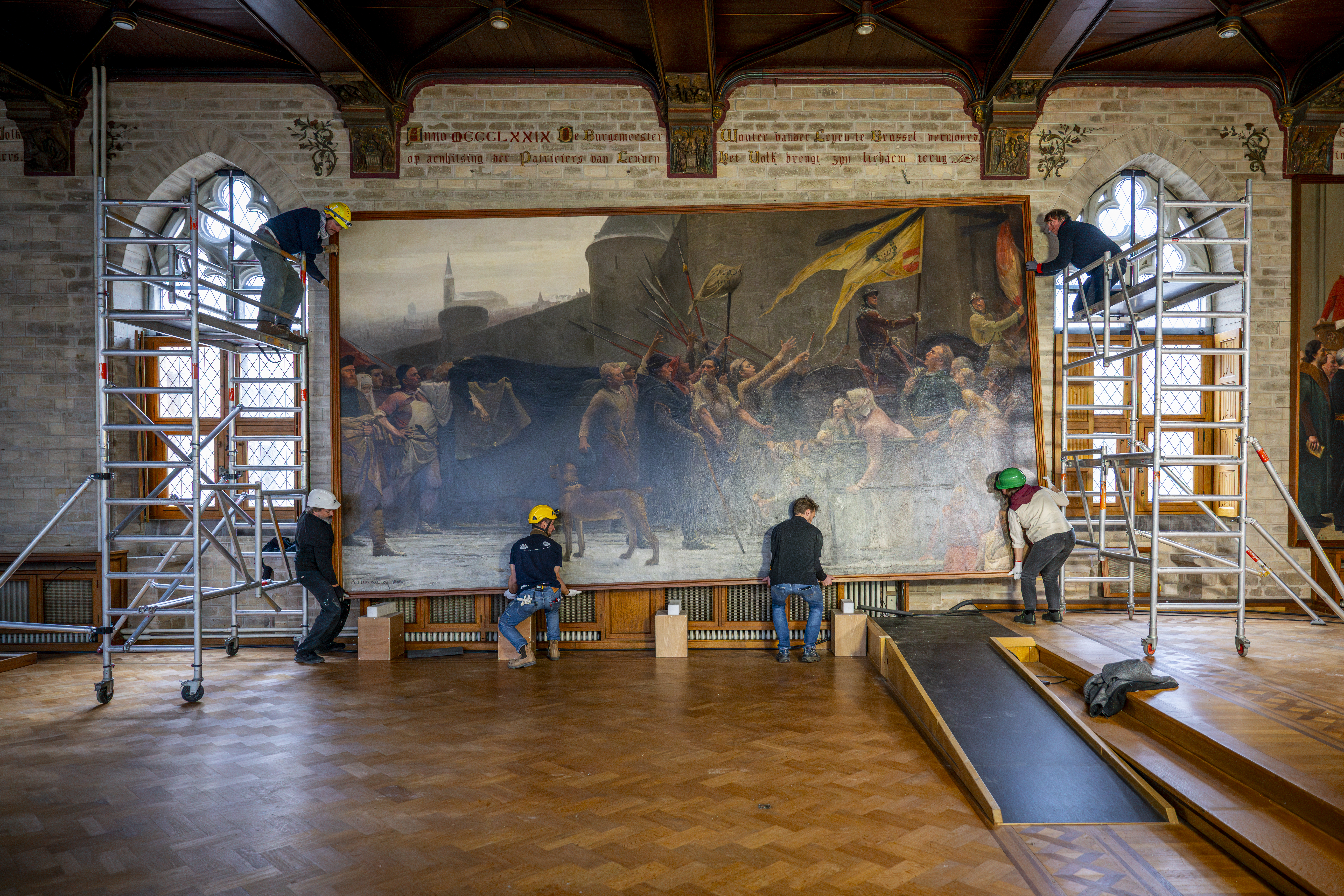 “Deze werken vertellen mee het verhaal van Leuven en verdienen dan ook dat we ze goed bewaren”, vertelt schepen van cultuur Bert Cornillie. “De meest monumentale doeken – waaronder de historische taferelen uit de Leuvense geschiedenis in de Gotische Zaal – worden nauwkeurig opgerold. Zo kunnen ze vlot door de deuropeningen en nemen ze minder plaats in bij de opslag. Dit gaat om echt specialistenwerk, want door de omvang is de demontage allesbehalve eenvoudig. M Leuven, dat het kunstpatrimonium in het stadhuis beheert, werkt voor deze delicate opdracht nauw samen met partner IPARC.”