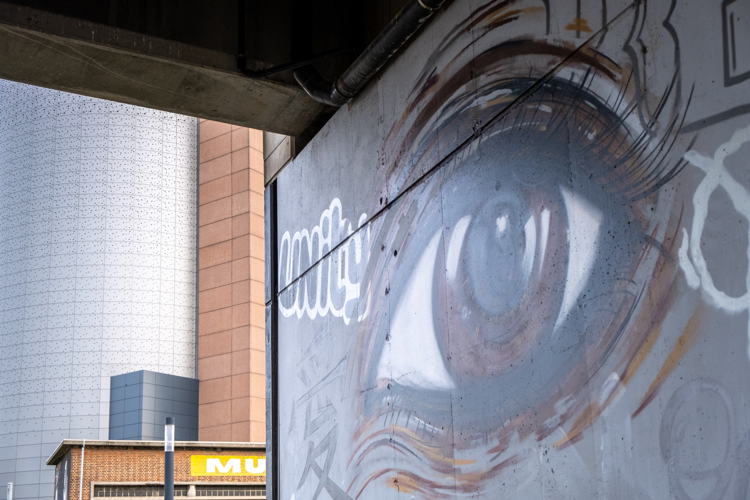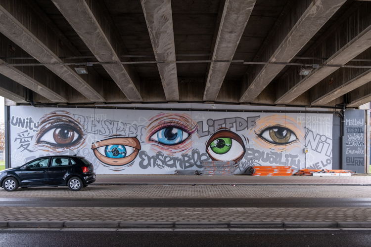 Aan het viaduct aan de Vaart in Leuven werd de voorbije week een nieuw kunstwerk gerealiseerd. Op het werk zijn verschillende ogen te zien, in allerlei vormen en kleuren, met daartussen woorden die samenhorigheid symboliseren. “De ogen representeren onze multiculturele samenleving”, aldus kunstenaar Mattey. “Bovendien dragen ze dezelfde functie uit voor iedereen. Ze bepalen hoe we kijken naar de wereld.” Met de muurschildering wil Ensemble een boodschap van eenheid verkondigen en onze ogen openen voor problematieken zoals racisme en discriminatie.
