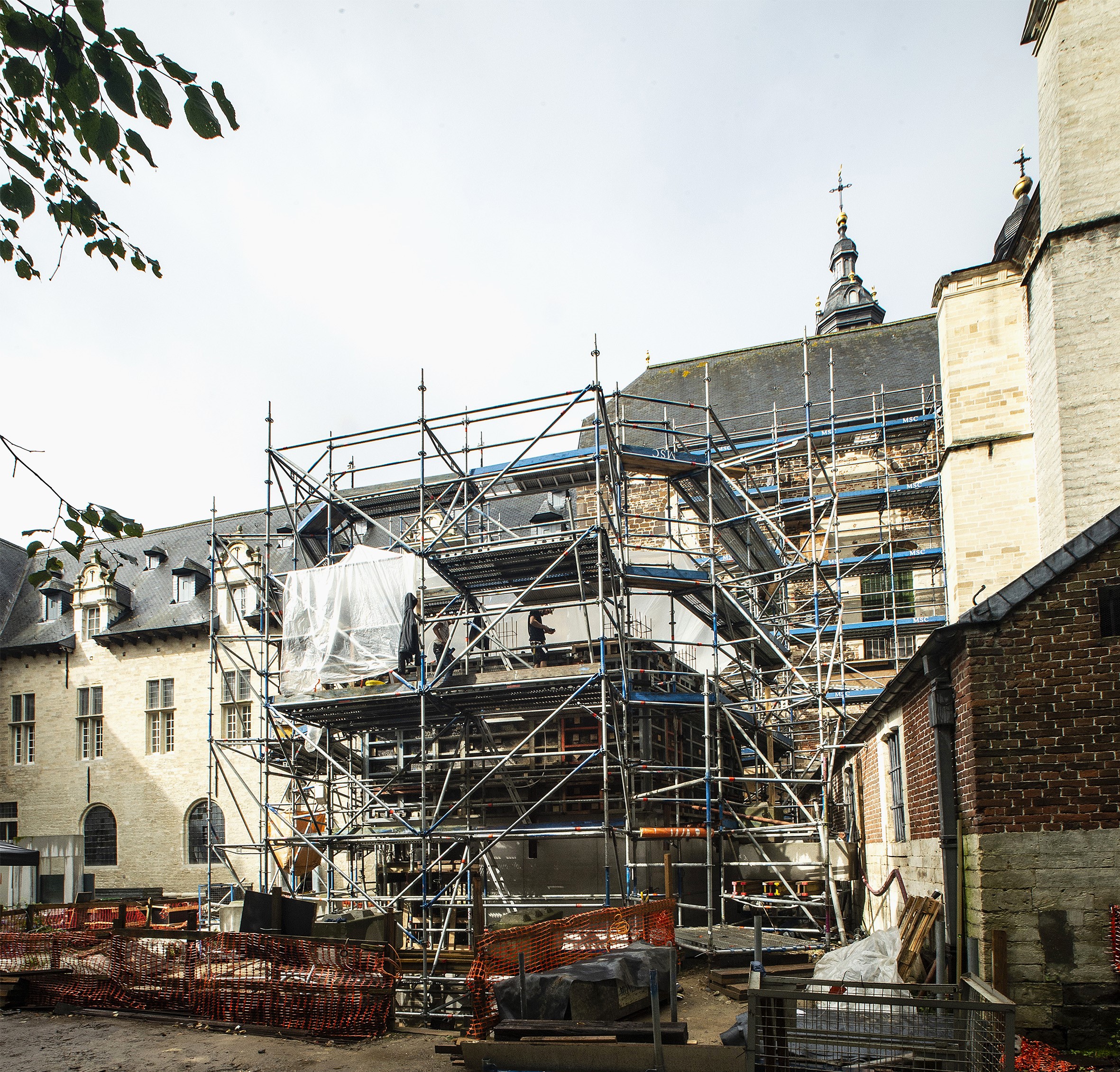 Gezien het bijzondere patrimonium is ten volle gestreefd om de nieuwe volumes op te laten gaan in het bestaande erfgoed. Zo werd het betonnen torengebouw nadrukkelijk met een punt naar de historische gevel geplaatst. “Dit maakt dat de toevoeging haast los lijkt te staan van de gevel en dat de historische gevel in z’n eer gelaten wordt. Bovendien ontstaan zo vanop de trap van het torenvolume perspectieven die indrukwekkende zichten opleveren. De vijfkantigheid van de toren maakt namelijk dat je ware detailzichten meekrijgt van de waardevolle romaanse gevelelementen, restanten van een kerk uit de 13e eeuw “, licht het architectenbureau Robbrecht en Daem toe. “Niet enkel de bestaande gevel, ook de bestaande openingen in die gevel (op één opening na) blijven trouwens behouden. Ingrepen worden op de originele verhoudingen afgesteld. De nieuwe, veelhoekige volumes herinneren vaag aan het fenomeen van annexgebouwen binnen historische gebouwgehelen (denk aan baptisteria, sacristieën of voetwasplaatsen). Die gebouwen zijn relatief autonoom maar behoren tezelfdertijd tot een groter geheel. De torenvolumes krijgen een gelijkaardige uitdrukking mee.”